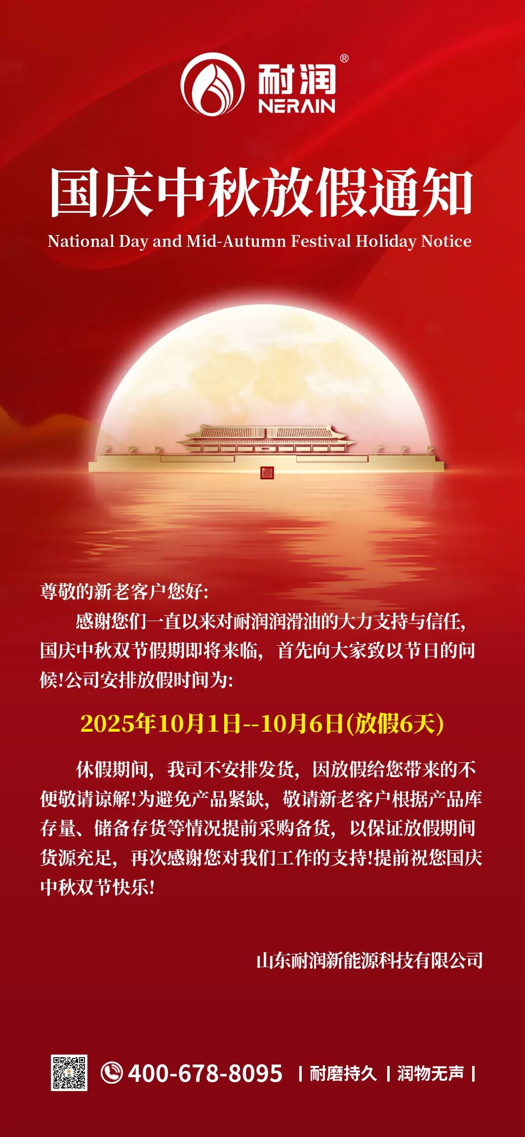 雙節(jié)同慶 | 耐潤潤滑油2025國慶&中秋放假通知!